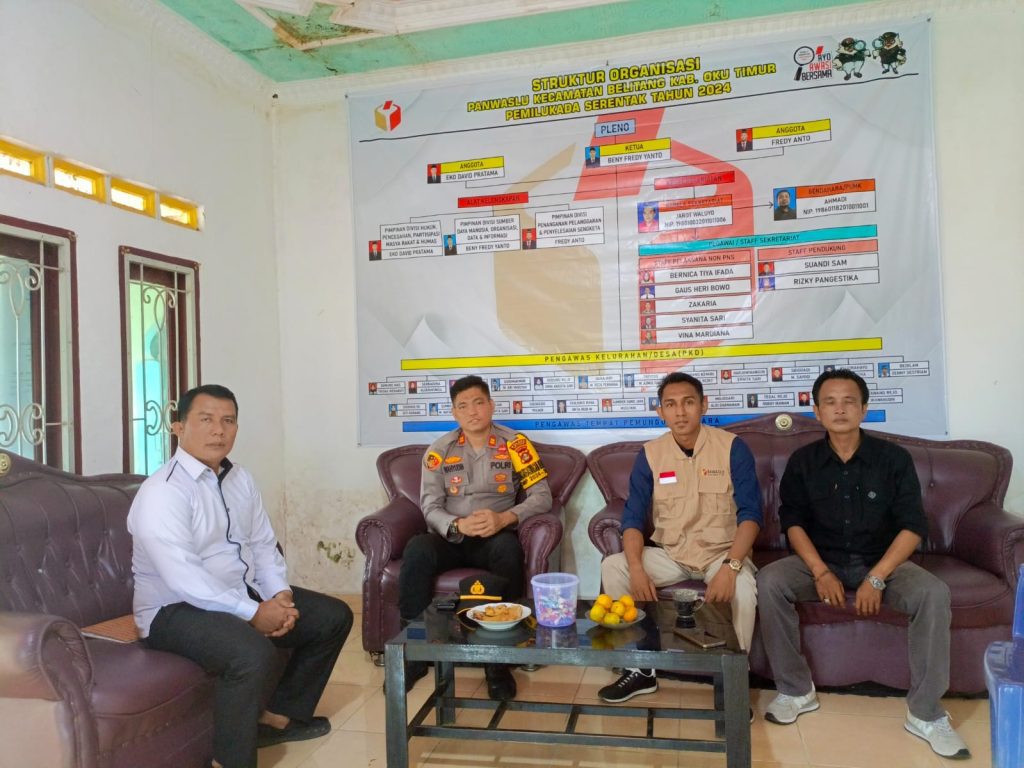 OKU Timur –Polres OKU Timur, Polsek Belitang 1 yang di pimpinan Iptu Wahyudin SH M.si hari berkunjung ke kantor panwascam di kecamatan Belitang, selain bersilaturahmi dia sekaligus menyampaikan dan menghimbau terkhusus penyelanggara Pilkada dan Unsur Tripika Kecamatan untuk melaksanakan tugas sesuai Tupoksi dan tanggung jawab, menghindari ujaran kebencian, isu sara, yang menyebabkan perselisihan, Black Campaign, Money Politik, Intimidasi maupun perbuatan – perbuatan yang dapat menjadi pemicu pertikaian di lapangan.