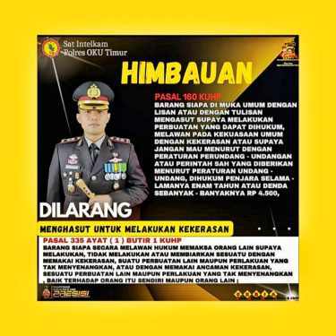 OKU Timur – pesan penting Kapolres OKU Timur AKBP Dwi Agung Setyono terkait pasal 160 dan pasal 335 ayat (1) butir 1 KUHP, dalam tulisan di ikuti gambar yang Familiar di kepolisian OKU Timur dengan narasi pada gambar menghimbau : pasal 160 KUHP