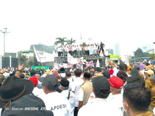 Dan juga hari ini harus ada kepastiannya untuk pengesahan revisi undang – undang Nomor 6 Tahun 2014. Aksi ini tidak memihak Capres manapun dan tidak memihka Caleg manapun tetapi ini merupakan suara dari seluruh Kepala desa, Perangkat Desa seluruh Indonesia. Jika kami tidak diperbolahkan masuk maka kami meminta kepada ketua DPR RI hadir di tengah – tengah kami. Apabila tuntutan kami tidak dipenuhi maka kami seluruh kepala desa, BPD dan perangkat Desa akan menolak tugas perbantuan Pemilu 2024 jika revisi undang – undang desa tidak disahkan ,” ujar H Surta Wijaya,S.P.D.,M,SI. selaku Ketua Umum APDESI saat menyampaikan orasinya.