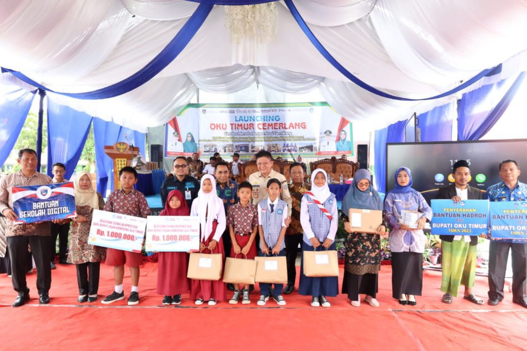 Dirinya juga mengatakan bahwa dalam kegiatan launching OKU Timur Cemerlang juga diserahkan piranti digital untuk 2 sekolah, pembagian 600 beasiswa prestasi, pembagian 1.000 seragam, pembagian laptop TK Negeri, pembagian buku kiterasi sebagai penunjang Sumsel Mandiri Pangan, bantuan alat kesenian dan penyerahan baju pengantin untuk Desa Cempaka.