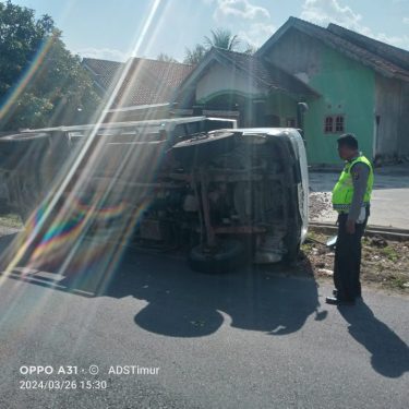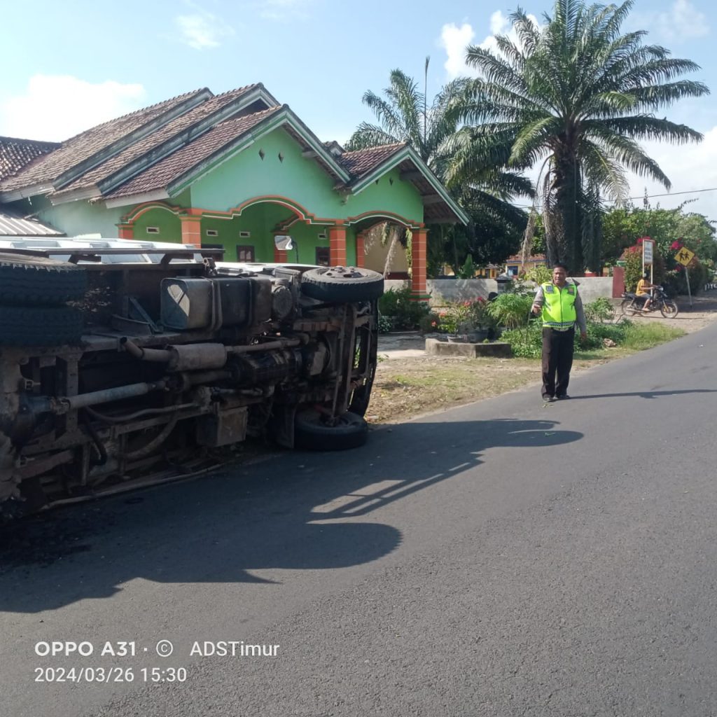 OKU Timur– respon cepat Sat- Lantas polres OKU Timur dalam menciptakan suasana aman lancar tepatnya di jalan lintas Desa Saung Dadi kecamatan BP Pliung, telah terjadi Laka tunggal sebuah mobil Dam Truk bernopol BG 8533 YB bermuatan batu koral.